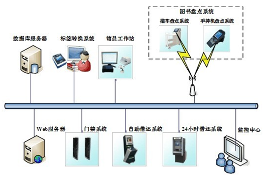 RFID圖書館智能管理系統(tǒng)采用分模塊實(shí)現(xiàn)方式。各個功能模塊可以單獨(dú)運(yùn)行,也可以組網(wǎng)運(yùn)行,系統(tǒng)模塊架構(gòu)組成包含:出入口RFID門禁認(rèn)證器、讀者自助借閱系統(tǒng)、館員工作站讀取器、便攜式館藏點(diǎn)檢器、智能流通標(biāo)簽轉(zhuǎn)換連接工作站、讀者自助還書系統(tǒng)、手機(jī)移動圖書館、智能安全監(jiān)測系統(tǒng)、應(yīng)用服務(wù)器及借閱信息提示器。整個圖書館RFID智能館藏系統(tǒng)應(yīng)用軟件包括:智能流通標(biāo)簽初始化轉(zhuǎn)換系統(tǒng)、管員工作站應(yīng)用功能集成系統(tǒng)、讀者自助借閱系統(tǒng)、讀者自助還書系統(tǒng)、手持設(shè)備查詢、順架及盤點(diǎn)系統(tǒng)、安全通道門系統(tǒng)。