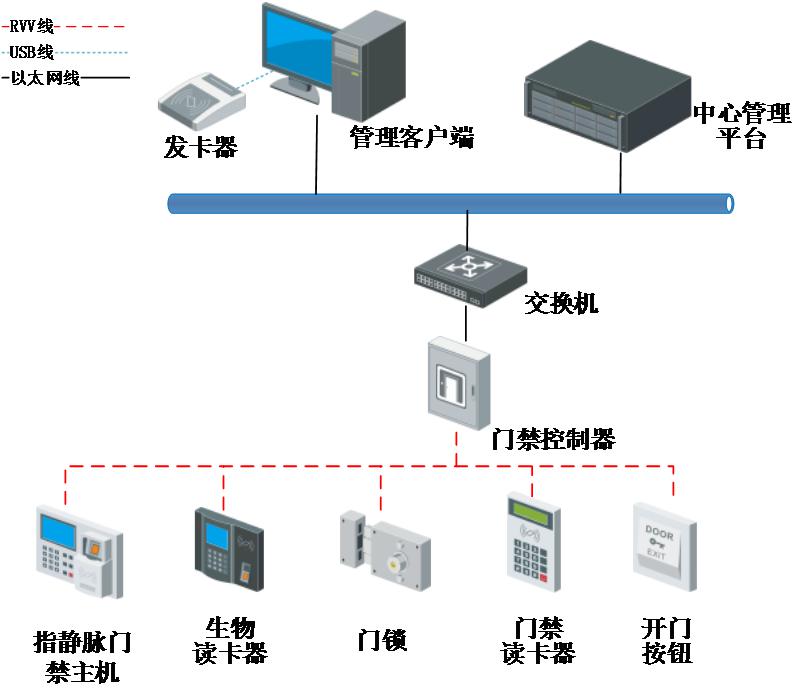 門禁讀卡器、生物識別讀卡器、開門按鈕、磁力鎖等前端門禁設(shè)備通過RVV4*0.75/ RVV2*0.75線纜接入到網(wǎng)絡(luò)門禁控制器上,而網(wǎng)絡(luò)門禁控制器通過非屏蔽雙絞線接入交換機(jī)經(jīng)局域網(wǎng)集成到安防綜合管理平臺上。